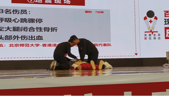 大赛采用“场景演练+主题演讲”的模式,模拟了触电现场、地震灾害现场、火灾现场、踩踏现场、运动伤害现场等5个常见且危险的场景。场景演练结束后,各参赛队的演讲选手围绕“关爱生命,救在身边”主题展开演讲。